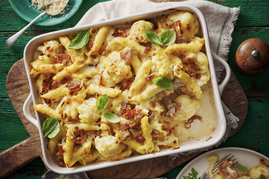 4. Preheat the oven to 180C/fan 160C/gas 4. Tip the onion and bacon, cooked pasta and cauliflower and the cheese sauce into a baking dish and stir to combine. Scatter over the remaining parmesan then put into the oven and bake for 20 mins or until golden. Leave to stand while you make a simple salad with rocket and cherry tomatoes. Serve the baked pasta with the salad plus a little balsamic for drizzling over the salad.
