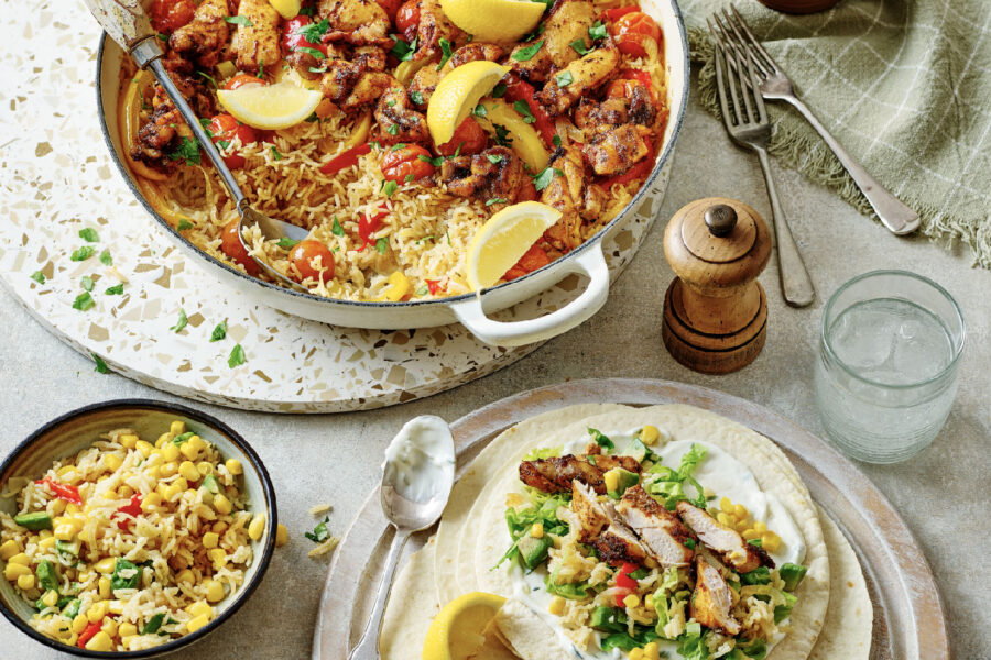 Take the leftover paprika chicken and cut into strips. Heat 4 Co-op Plain Tortilla Wraps according to pack instructions. Stir 198g drained tinned sweetcorn and ½ diced avocado into the leftover rice. Spread the wraps with Co-op Soured Cream and Chive Dip then pile the rice mix and chicken on top, plus some shredded lettuce and sliced jalapenos if you like a little heat.
