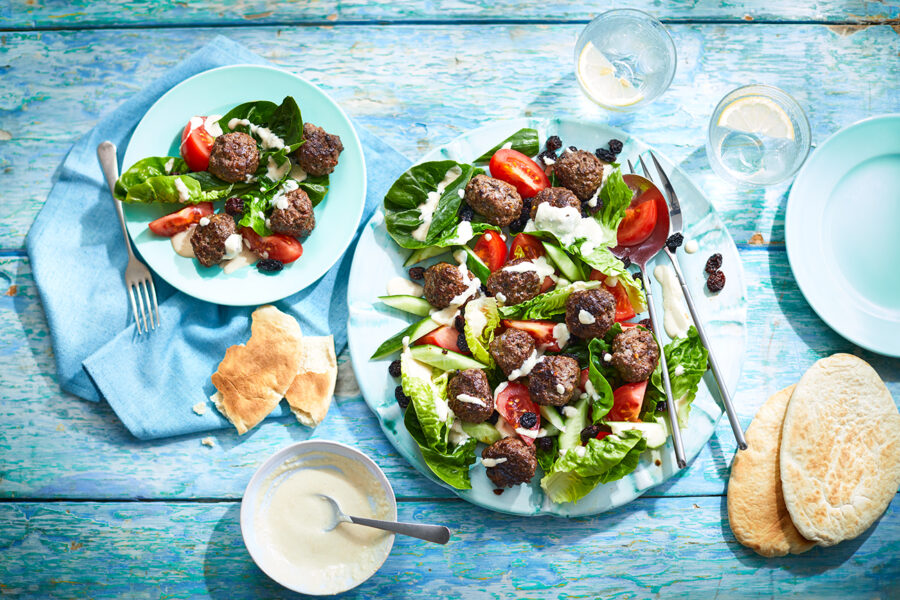 4.  Serve the cooked kofte on top of the salad and scatter with the raisins and chopped mint or parsley. Drizzle over the houmous dressing and serve with a spoonful of Greek yogurt on the side, if you like.