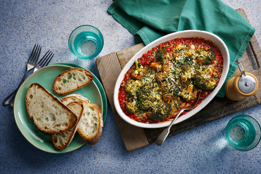 Roasting this winter brassica elevates it to another level. This special dish is substantial enough to make a lovely veggie main, try it with rice or even roast spuds and a simple green salad.