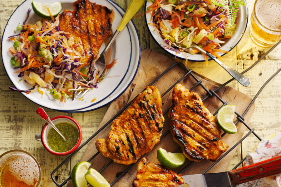 These flavoursome chops are great on the grill for summer. The fruity slaw would also work nicely with chopped fresh mango.