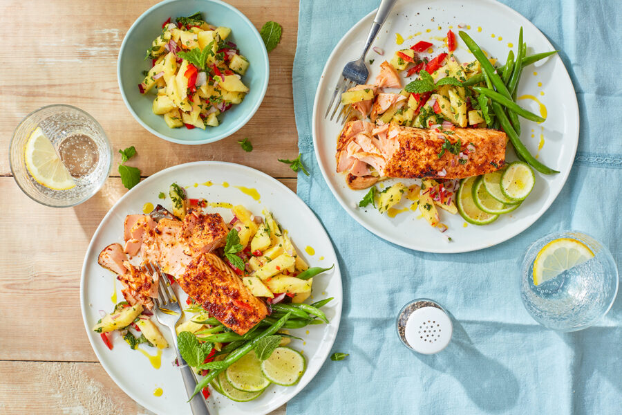 Sweet and spicy, this blackened Cajun salmon makes a tasty, light midweek supper. The fish is rich in omega-3 and the fruity salsa is a great source of vitamin C.