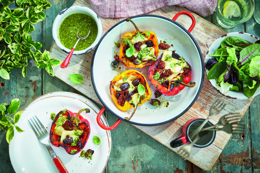 3.  Divide the pepper halves between 2 plates and drizzle with a little sundried tomato or green pesto and top with basil leaves, to serve.
