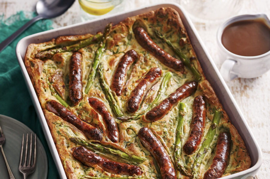 - Remove the roasting tin from the oven and, working quickly, add the asparagus tips amongst the sausages, then pour over the batter (it should sizzle as it is added to the oil). Bake for 30-35 mins until golden and puffed up nicely.
