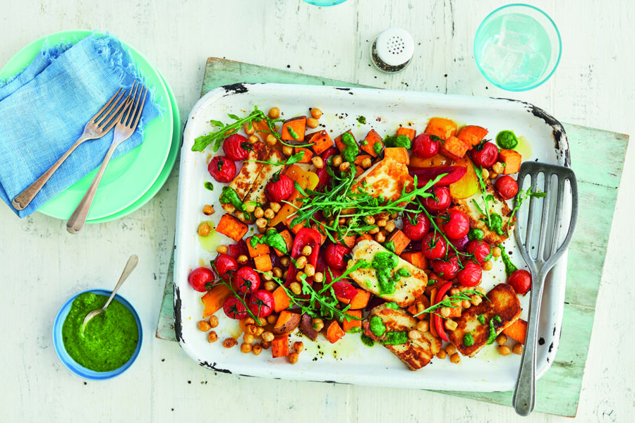 Halloumi, chickpea and veg traybake