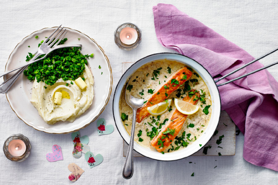5. Stir the herbs into the cream sauce along with a squeeze of lemon juice. Season to taste. Serve the salmon fillets with the sauce and the peas on the side, and some mashed potato, if you like.