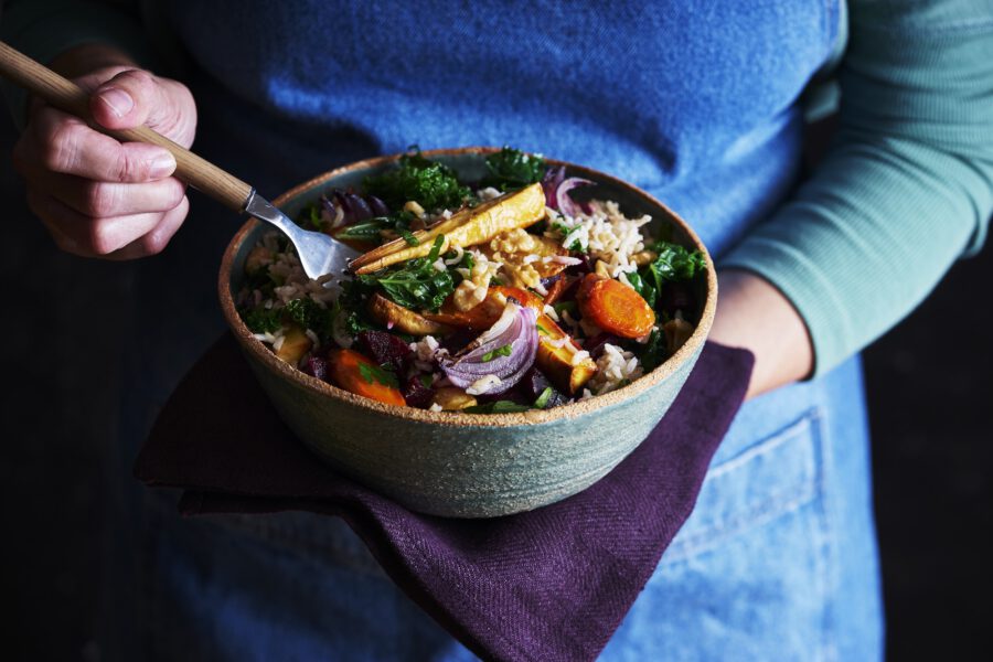 Make the most of seasonal root veg with this colourful bowl. Great for supper, or try boxing it up for lunch – just keep the dressing separate and drizzle over when you’re ready to eat.