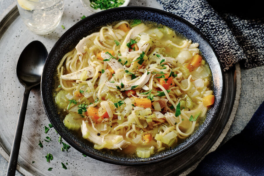 - Gently take the chicken out of the slow cooker, shred the meat off the bones. Discard the bones and return the pulled meat to the slow cooker. Add the dried noodles then cook for 25-30 mins until the noodles are tender. Add the lemon juice, chopped fresh parsley and season to taste. Serve spooned into deep bowls with extra parsley or a dollop of mustard if liked.