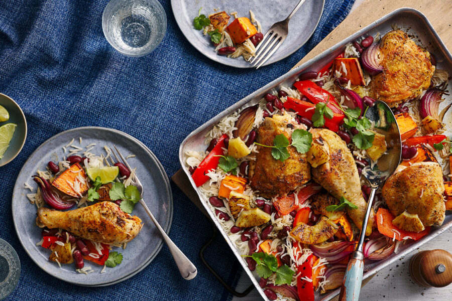 5. Take the tray out of the oven, remove the chicken, cover and set aside to rest. Stir the cooked rice and beans into the veg, scatter over the chopped pineapple and drizzle with the remaining 1 tbsp pineapple juice.
