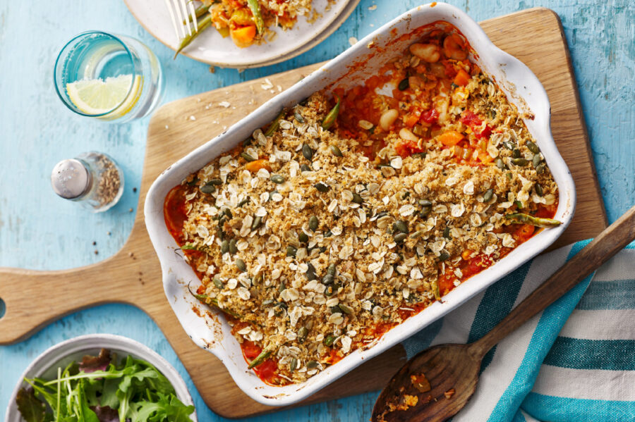 - Put the vegetable filling into a large baking dish. Scatter with the topping and bake for 15-20 mins until golden and bubbling.