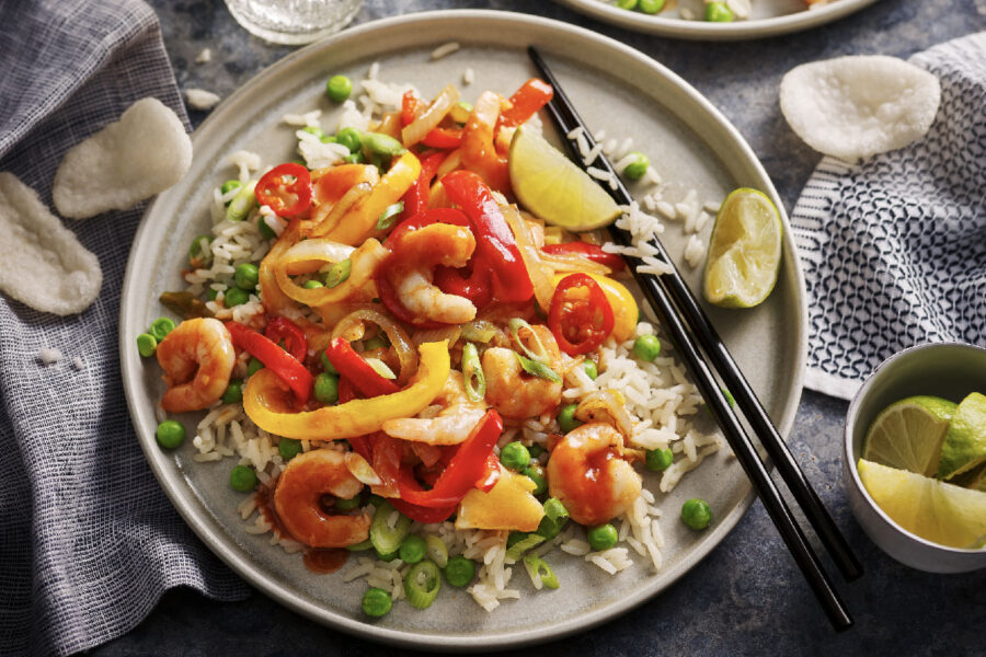 - Heat the sunflower oil in a wok. Stir-fry the onion, ginger, garlic and chilli for 1-2 mins, then add the peppers and cook for 2 mins more. Pour the sauce into the pan, bring to a simmer, then add the prawns and the pineapple from the tin. Simmer for 2-3 mins until the sauce has thickened and the prawns are piping hot.