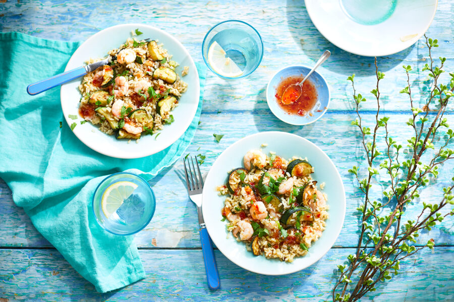 This nutritious mix of prawns, brown rice and veg is a great supper dish for two but can easily be made to serve four – just double the ingredients.
