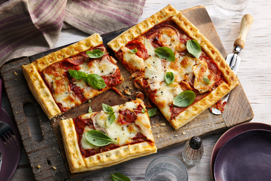 - Put the passata in a bowl, then stir in the tomato purée, garlic and dried basil; season with salt and pepper. Spread the tomato mixture over the centre of the pastry, up to the border. Then scatter over the onions and chorizo, followed by the cheese.